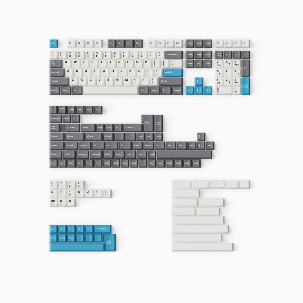 그레이·화이트·블루 컬러 조합의 이 키캡 세트는 이중사출 각인으로 제작되어,