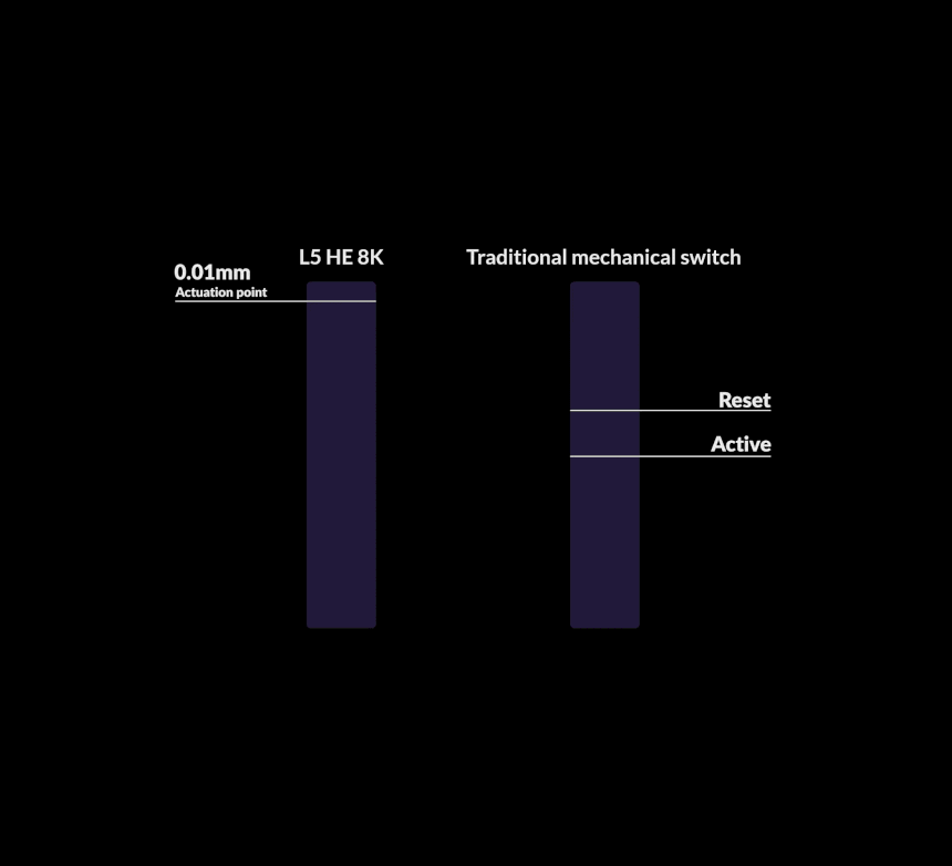 게임패드, 조이스틱에서만 가능했던 가변 입력을 키보드에서 구현합니다. 키를 얼마나 깊이 눌렀는지에 따라 이동 속도, 액셀 강도, 슛 파워 등을 다르게 조절할 수 있습니다. 레이싱 게임에서 섬세한 드리프트, 피파 같은 스포츠 게임에서 정밀한 강도 조절 eX75 8K HE로 정복해보세요.